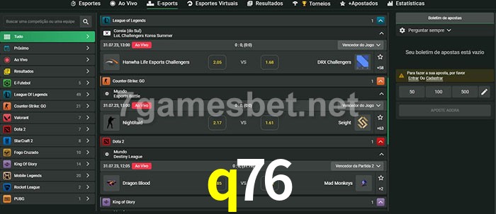 O q76 oferece uma grande seleção de opções de apostas em e-sports com probabilidades competitivas